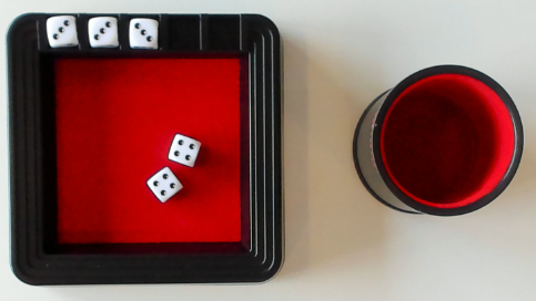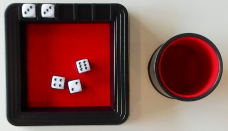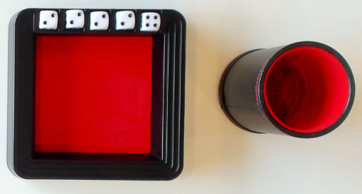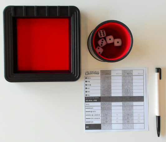 주사위 트레이를 테이블 가운데 두세요. 주사위 5개를 주사위 컵에 담아 트레이 옆에 두세요.