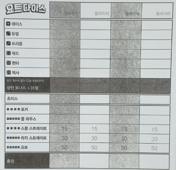상단 6칸에 적은 점수의 합이 63점 이상이라면 35점을 추가로 획득합니다.